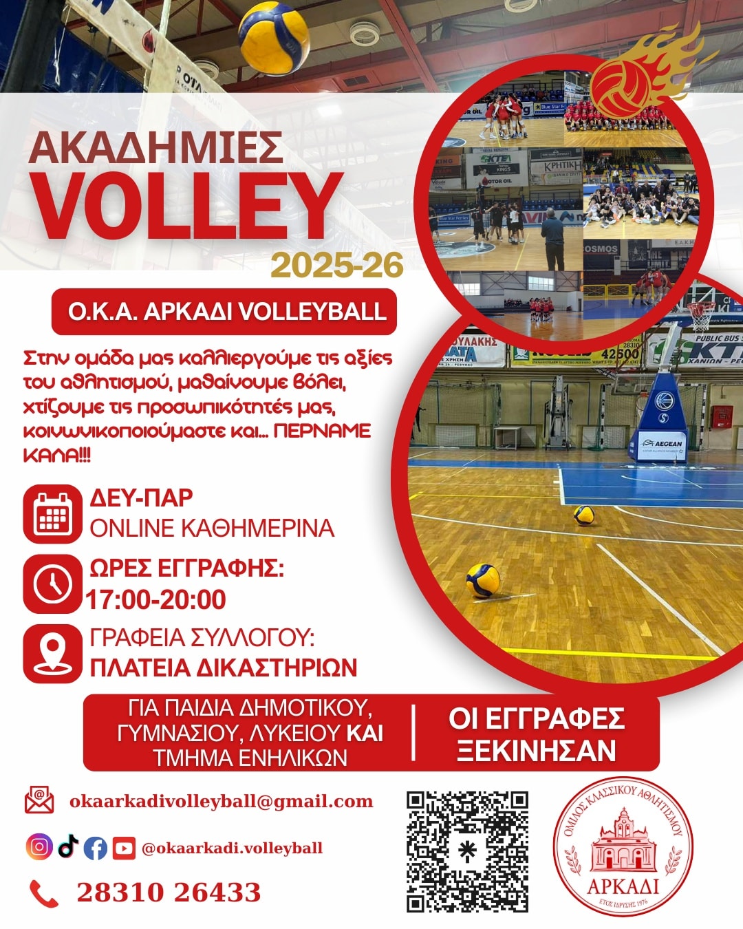 Οι εγγραφές 2025-2026 στον Ο.Κ.Α. “ΑΡΚΑΔΙ” στο τμήμα του βόλεϊ ξεκίνησαν Η ΝΈΑ ΣΕΖΌΝ (2025-2026) ΞΕΚΙΝΆΕΙ ΑΠΌ ΣΉΜΕΡΑ!!!! Οι εγγραφές στον Ο.Κ.Α. “ΑΡΚΑΔΙ” στο τμήμα του βόλεϊ ξεκίνησαν!!! Από σήμερα και μετά περιμένουμε μικρούς και μεγάλους να έρθουν στην ομάδα μας και να μάθουνε βόλεϊ, να καλλιεργησούν τις αξίες του αθλητισμού και να κάνουν νέες φιλίες!!! Οι εγγραφές φέτος θα γίνονται ηλεκτρονικά (αλλά και γραπτά για όσους το επιθυμούν) μέσω της φόρμας που μπορείτε να βρείτε στο link που βρίσκεται στο bio (περιγραφή) του λογαριασμού μας καθώς και στο QR code που βλέπετε στο post και στην αφίσα εγγράφων (link: